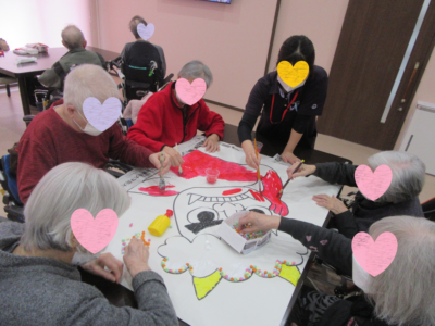 節分に向けて、デイルームに飾る壁画を制作しました✨ 今回はレンボーヘアーの大きな赤鬼を作ります🌈👹 職員が下絵を書き、利用者様に作業していただきます😃 こちらでは鬼の頭に、パステルカラーのお花紙をたくさん 丸めたものを、貼り付けていきます🌸 […]