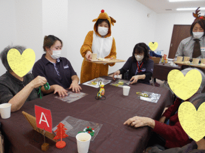 出来上がったトナカイやサンタ帽をかぶった職員が、飲み物と