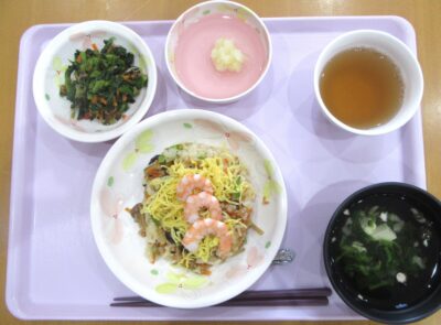 梅和え、ピーチゼリーと春らしい御膳です